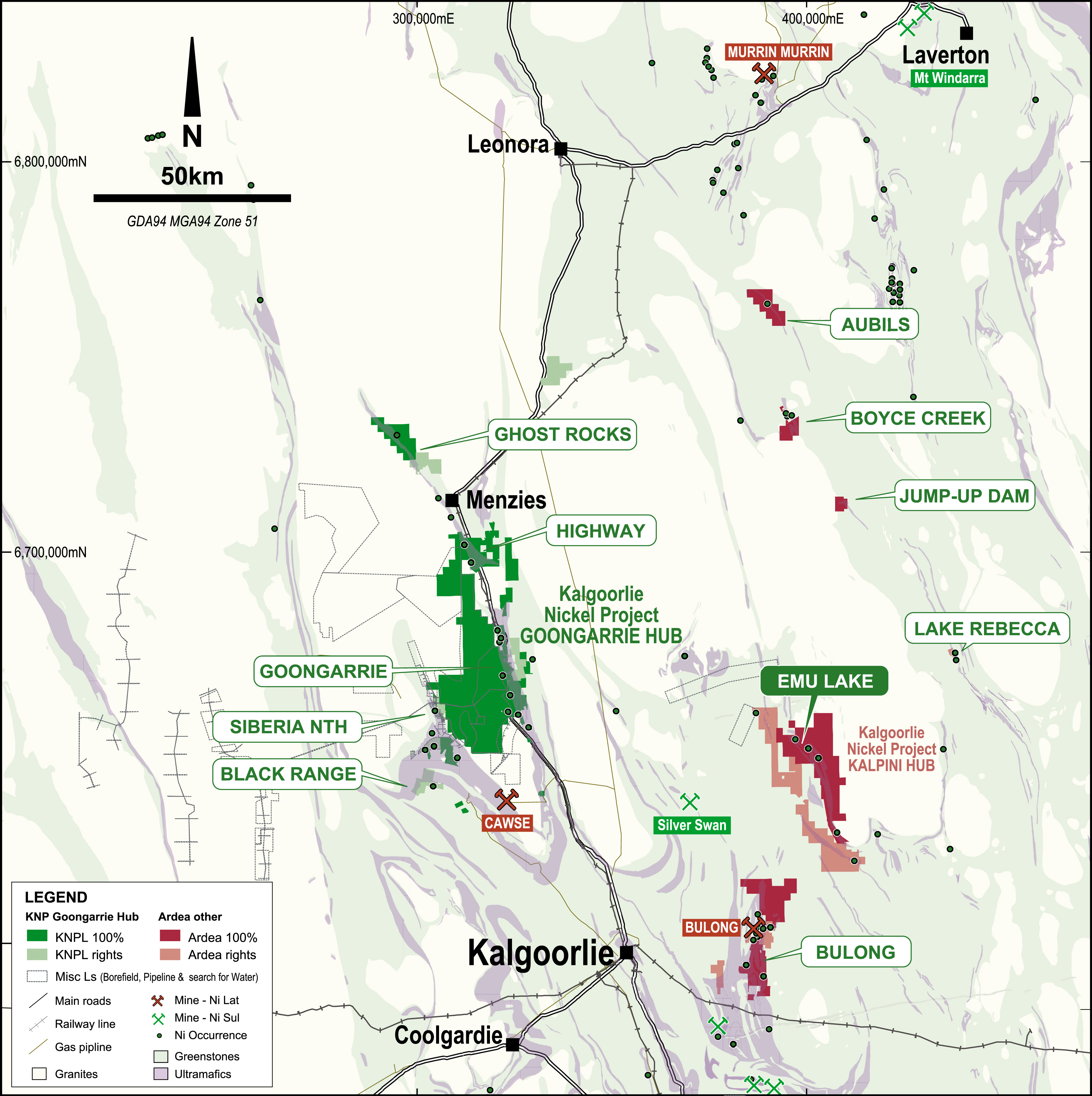 Ardea’s extensive and strategic land holding in the Eastern Goldfields of WA covers ~3,500km². In addition to the globally significant nickel-cobalt-scandium KNP resource, the tenure represents unrivalled Battery and Critical Minerals exploration potential.